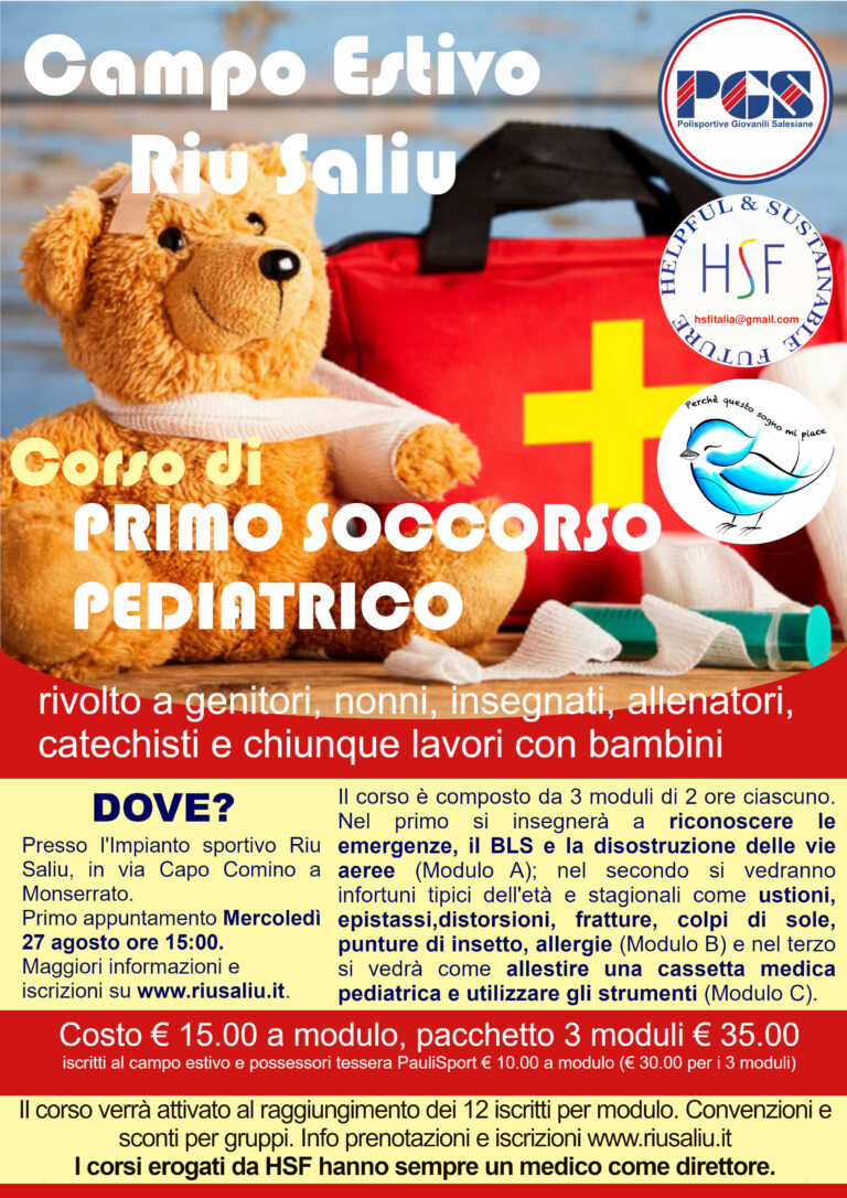 Disostruzione delle vie aeree, BLS, punture di insetto, colpi di sole, allergie….questi alcuni degli argomenti del corso che si terrà il 27 settembre alle 15:00 presso i locali dell’impianto Riu Saliu. Il corso, nato dalla collaborazione fra PGS, HSF e…